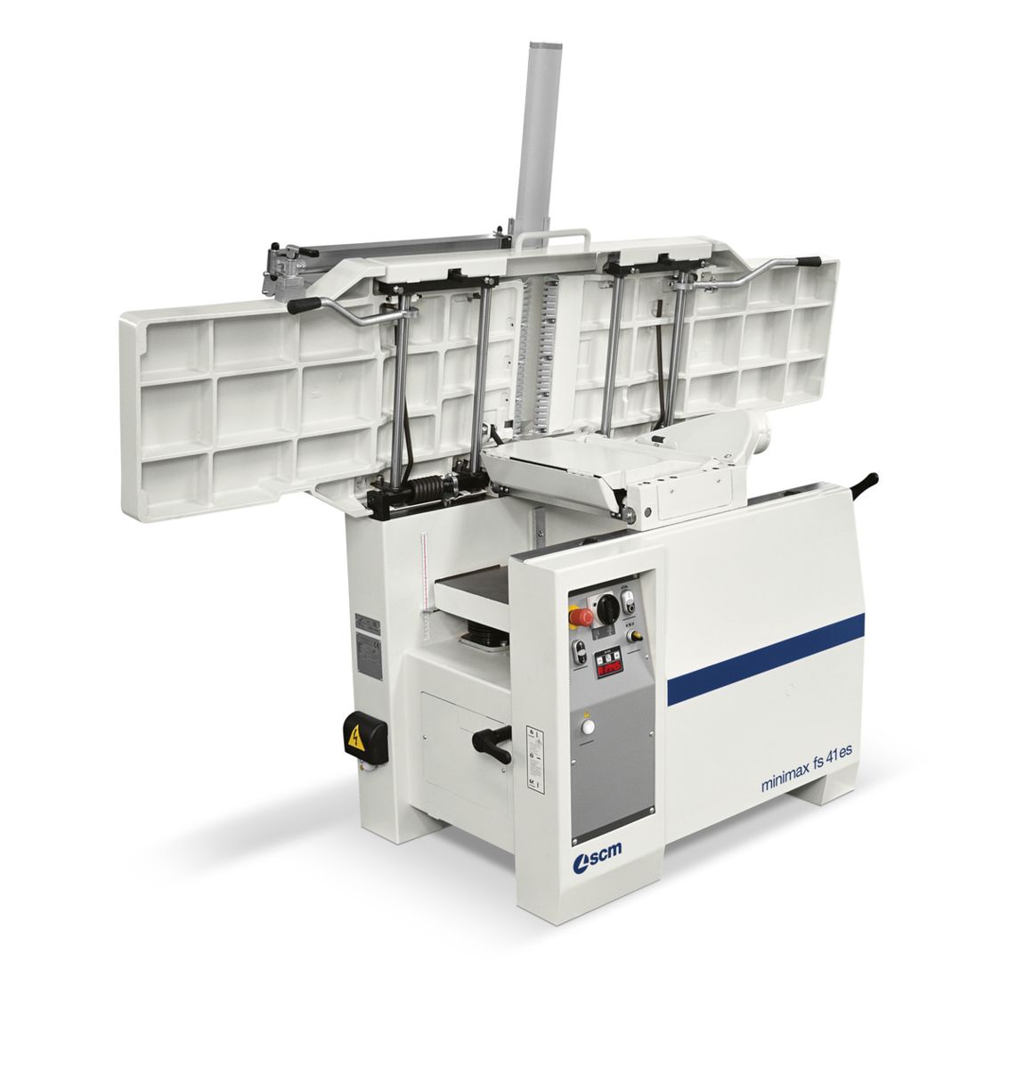 Aplainamento confortável e preciso. A máquina adota soluções ergonômicas, como mesas de desempeno de 2200 mm, em ferro fundido nervurado, com abertura simultânea para o interior da máquina em um ângulo de 90°. Para garantir máxima estabilidade duradoura, a mesa de desengrosso em ferro fundido é levantada por 4 fusos com rosca trapezoidal, protegidos contra poeira.