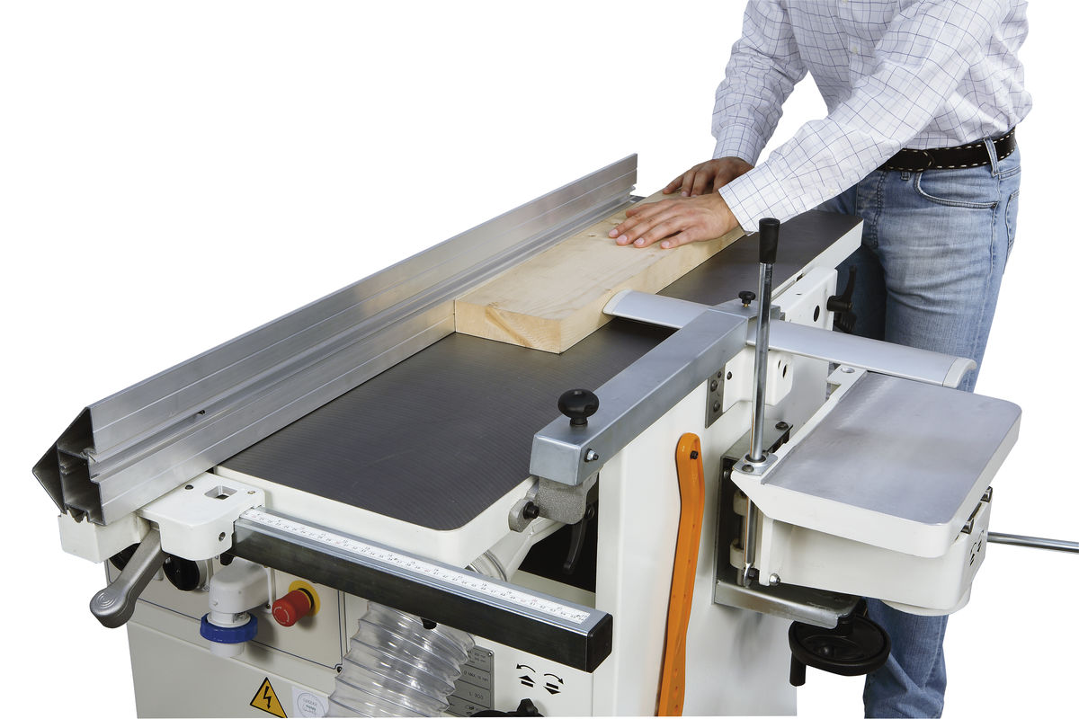 Para manter a máquina compacta e facilitar a usinagem, a mesa de revestimento se abre para o interior da máquina. Graças a um sistema de alimentação eficiente, a unidade de espessamento pode processar madeira de até 200 mm de espessura.