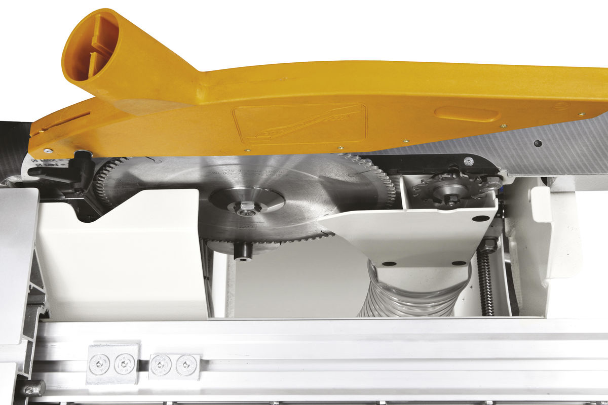 Novo conjunto de serra com lâmina de diâmetro máximo de 315 mm, mesmo com a lâmina riscadora instalada. A nova unidade riscadora pode ser fornecida sob pedido e é facilmente ajustável a partir do exterior da máquina.