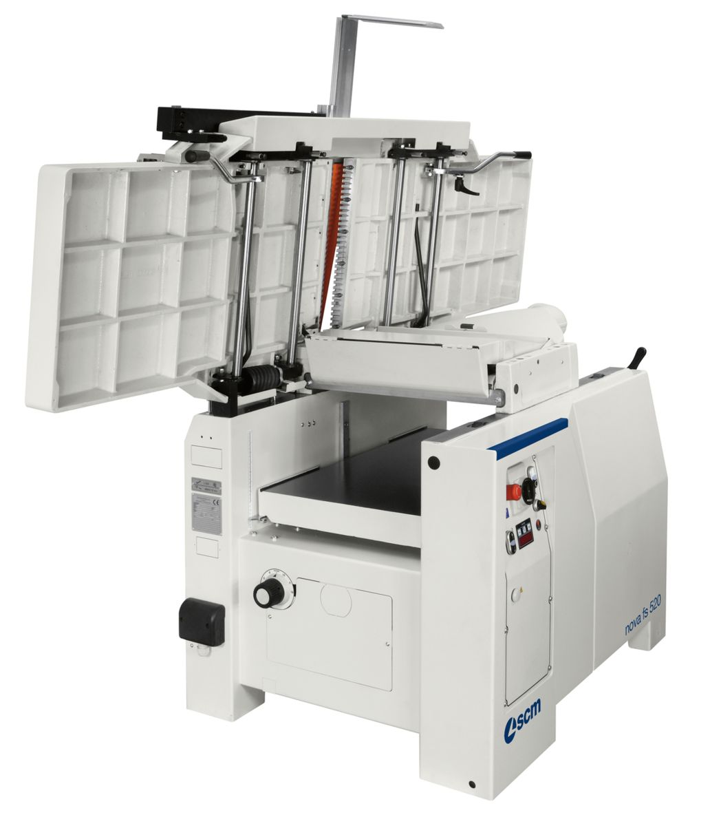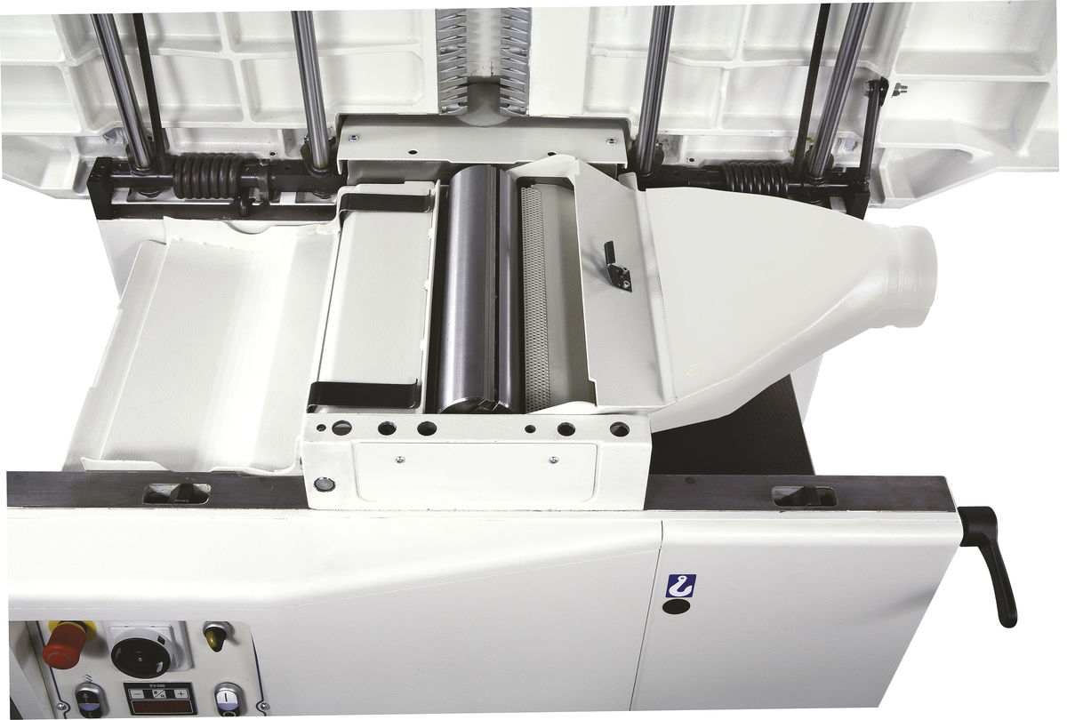 com o bloco de corte de 95 mm de diâmetro e 4 facas. Para um acabamento impecável, a pressão dos rolos de alimentação do espessador pode ser ajustada de acordo com o tipo de madeira usinada. A alimentação do rolo tem um perfil helicoidal para garantir uma alimentação firme e constante da peça de trabalho, enquanto o rolo de saída em aço jateado mantém o acabamento perfeito do pós-processamento.
